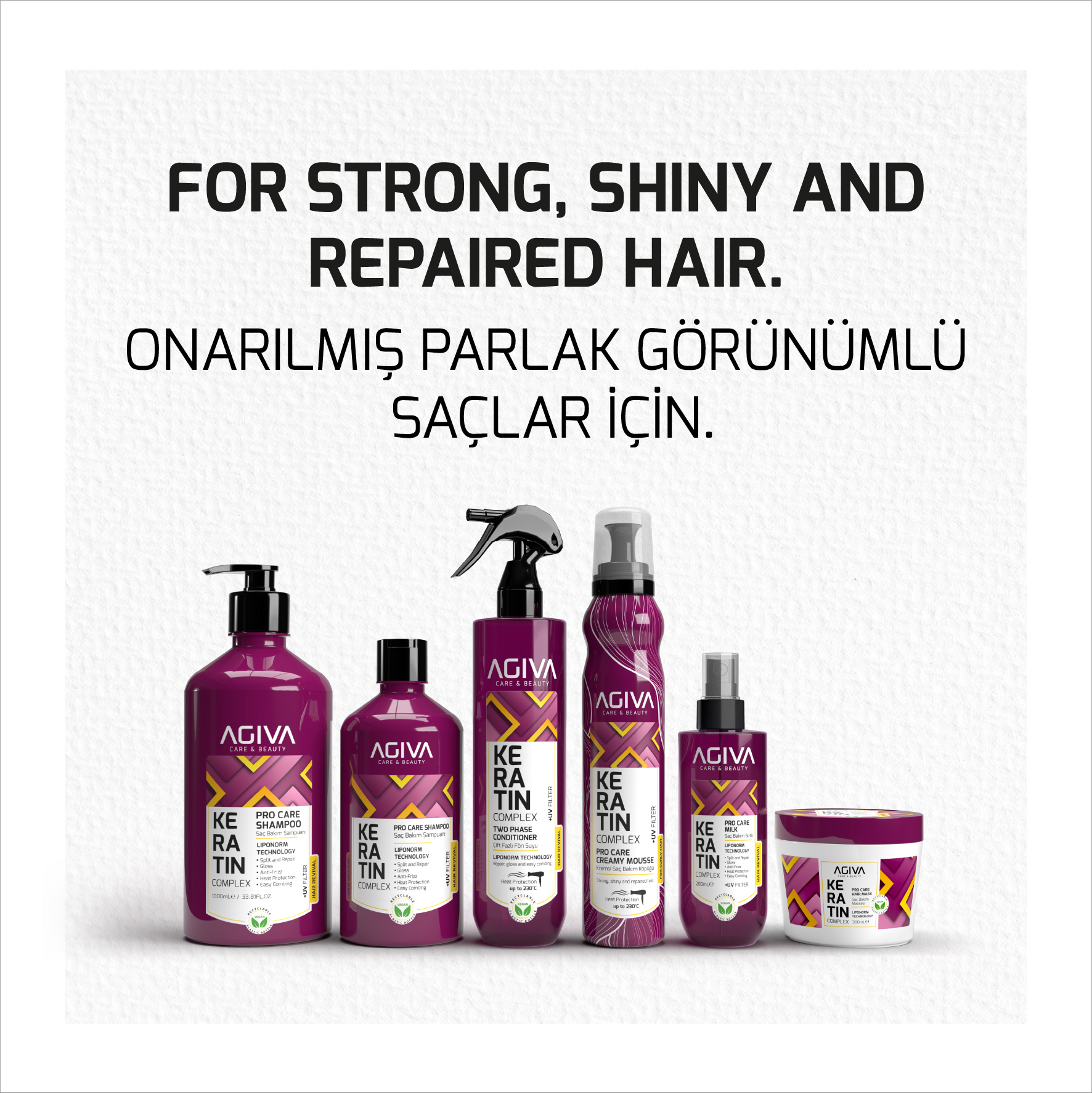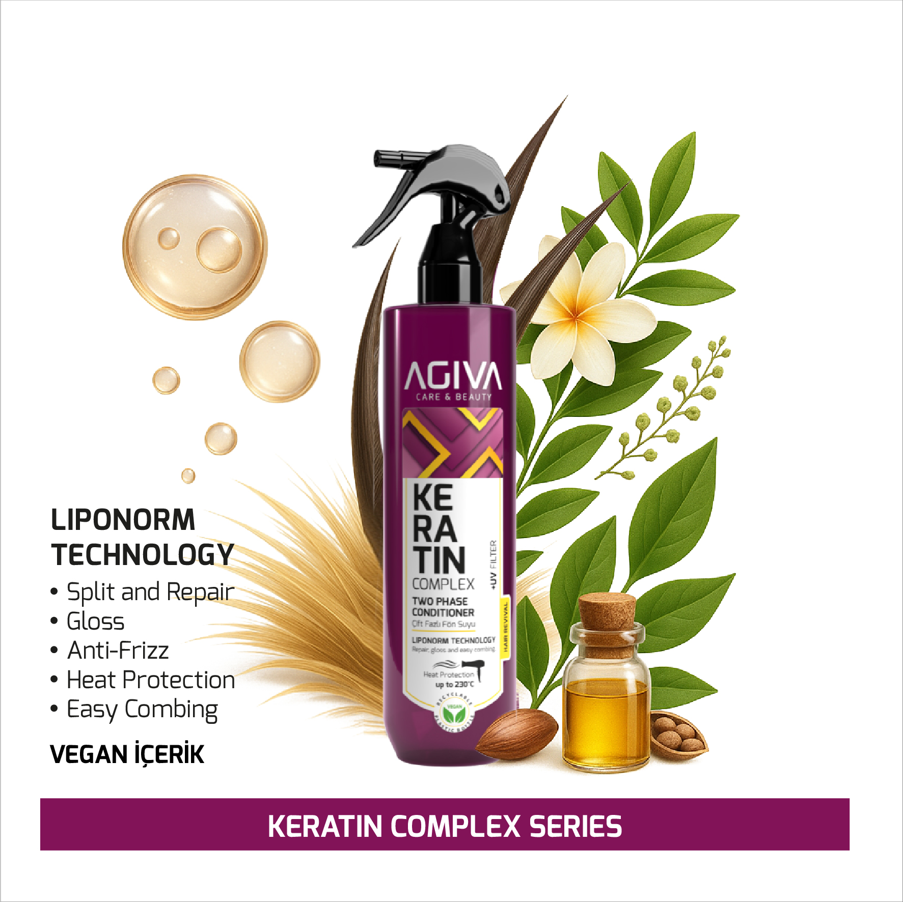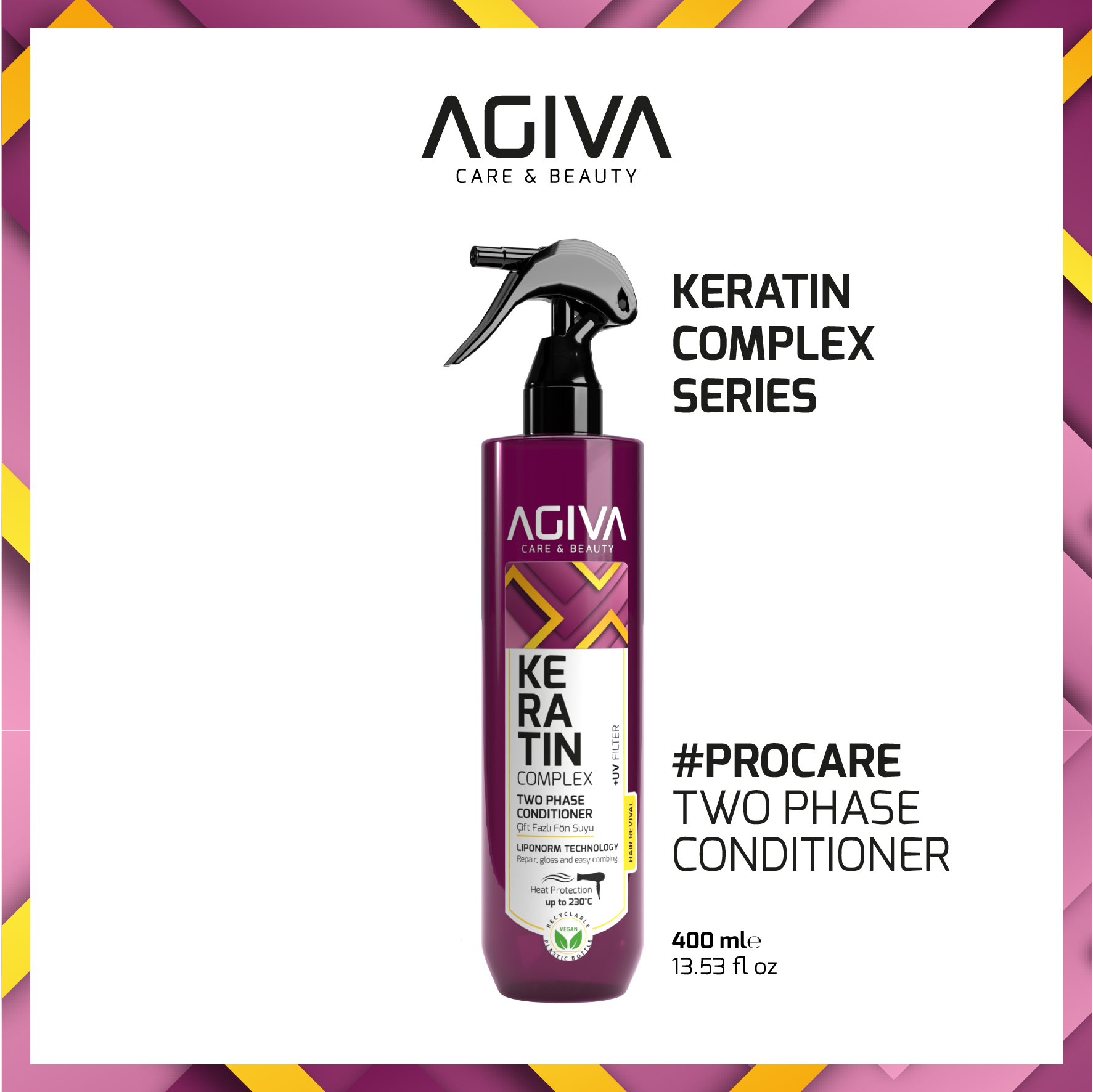 Agiva Keratin Complex Çift Fazlı Fön Suyu keratin mineralleri, TRI-MEA ve Akasya kolajeni içeren formülüyle saç tellerini derinlemesine besler, onarır ve kırılmaları önlemeye yardımcı olur. Isıya karşı koruma sağlayarak saçın doğal nemini hapseder, yumuşaklık ve parlaklık kazandı...